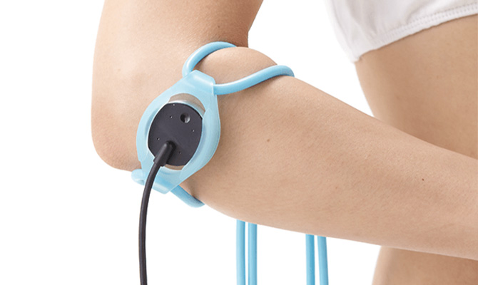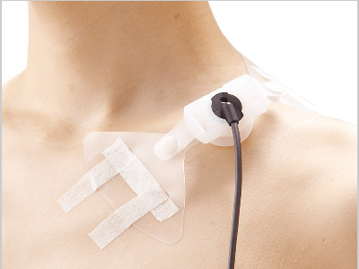 固定具〈ハネ付〉は、プローブの金属部が患部に直接当たらない構造のため、従来のプローブ接触による痛みを軽減します。 また、自由に伸びるシリコン製の固定具〈D²〉は、固定しづらかった部位への装着を容易にし、手間もかかりません。