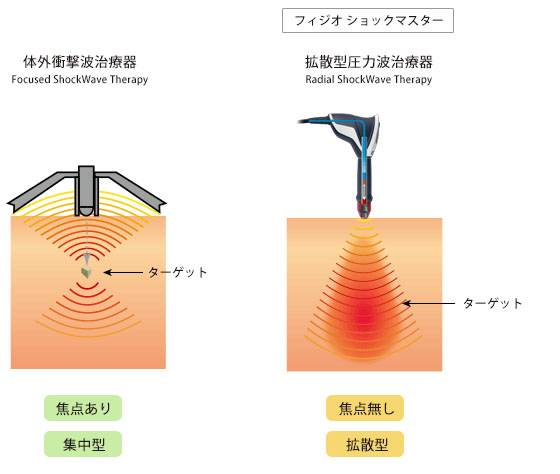 拡散型圧力波治療器であるショックマスターは、焦点が無く、拡散するため、ターゲットが広範囲に及び、筋・腱の治療に適しています。