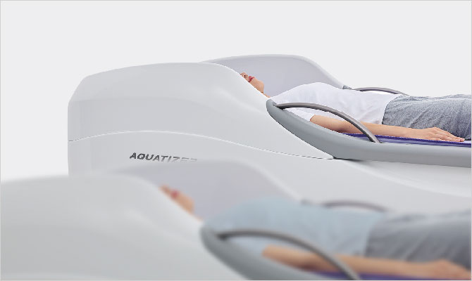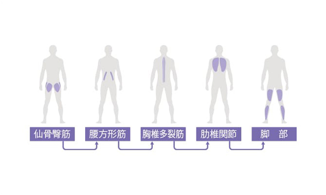 仙骨臀筋、腰方形筋、胸椎多裂筋、肋椎関節、脚部を順番に刺激します。各部位に合わせたノズルと独自のパターンが筋肉をほぐし、柔軟性の向上に繋げます。