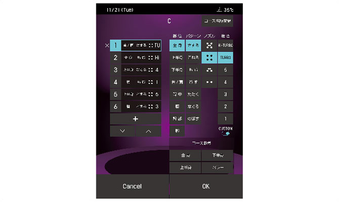 「上半身は強く揉むように」、「腰は弱く撫でるくらいで」、「首/肩はノズル2つで押すように」など要望に応じて、プログラムが細かく設定できます。
