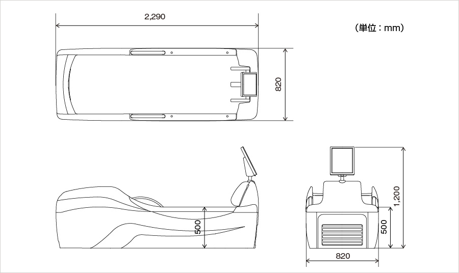 | 外形寸法(本体) | 幅820×長さ2,290×高さ1,200(mm) ベッドの高さ500(mm) |